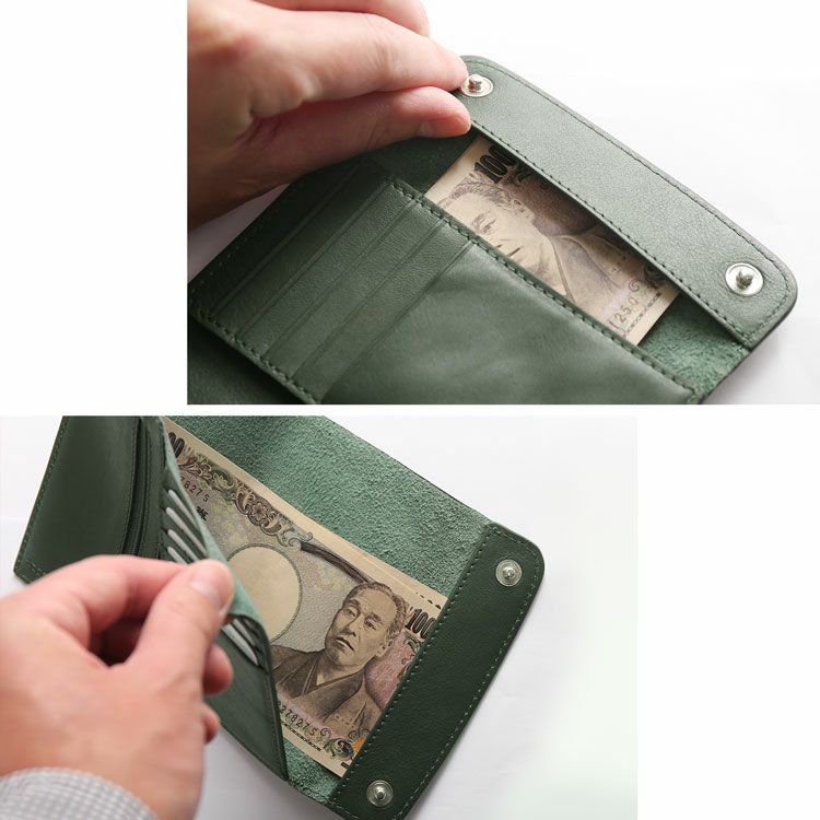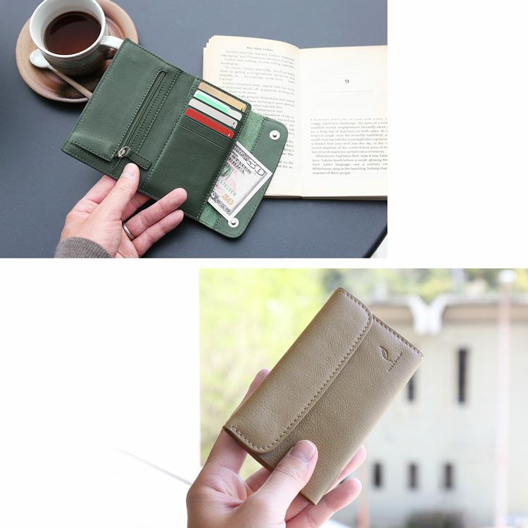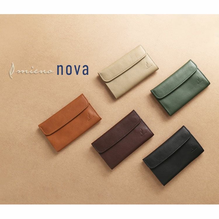 手軽に使える革製品を提案するmienoから、 素材にこだわる大人のための新シリーズ登場。 フラップは2つのスナップボタンで開き、 シンプルさと使い易さで、 アイデアを凝らした内装も魅力です。 使っていく人のセンスを格上げしてくれる nova(ノヴァ)レザーミニ財布をお楽しみください。 日常シーンに温もりと上質さをプラス。 柔らかい本革を使って、 使いやすさ、携帯しやすさに拘った スリムなミニ財布です。 一万円札を紙幣入れの奥まで入れると、 お札の端が少しだけ出る大きさです。 この部分で折ることで、 今までになかった新しいサイズ感を実現しています。 お札の端が少しだけ出ているので、 紙幣を掴んでサッと引き出して使えます。 財布の端にお札を入れ込んで使うことも可能です。 内装の革も柔らかく、 紙幣入れ部分は『ペロッ』と大きく開くので、 紙幣を収納するのも素早くできます。 カードホルダーが5つ付いています。 その奥もポケットになっており、ICカード等を入れるのに便利です。 ファスナー付き小銭入れは片マチ付きです。 くたっとした柔らかな質感が特徴のノヴァレザー。 ナチュラルテイストな風合いで上品な印象。 長く愛用したくなる味わいのある革。 表面は一枚のノヴァレザーで仕立てています。