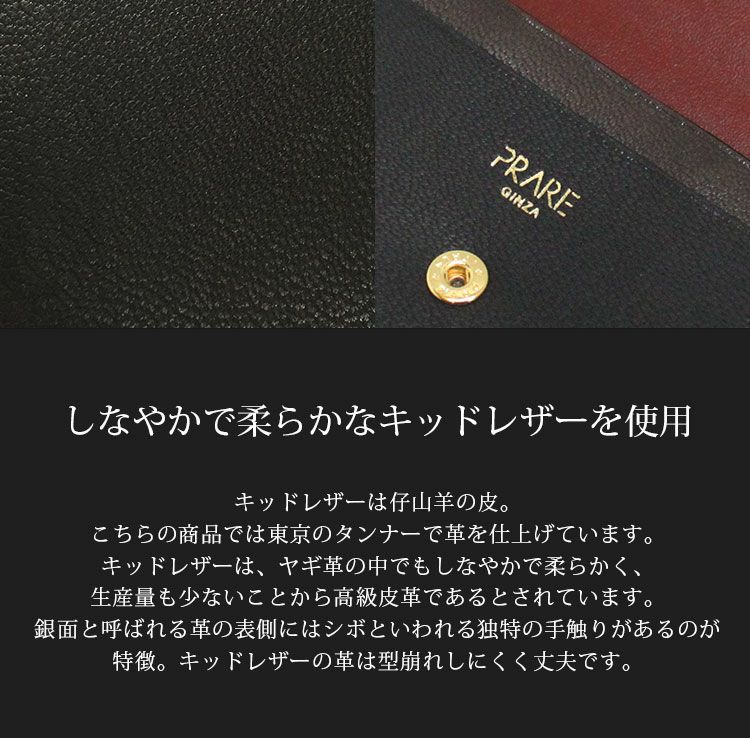 | 素材 | 表側:キッドレザー(本革)、内装:一部生地 |