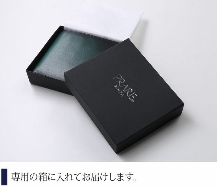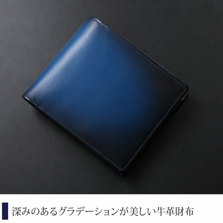 表革には日本職人の手作業によるシャドー加工を施した革を用いています。 型抜きした革1枚1枚に職人の手作業でエアーブラシによって吹き付けを施しています。 端から中央へ滑らかな濃淡を出していく作業は、職人の経験と技術のなせる業です。 硬く見えるデザインですが、使用している牛革はソフトで滑らかな手触りの牛革を使用。 思わず触れたくなる手触りと美しいグラデーションが魅力の財布です。 手に馴染む柔らかな触り心地。 美しいグラデーションが手元をオシャレに飾ります。 内装にMADE IN JAPANの文字が刻印されています。 日本製品の魅力として第一に挙げられるのが「作りの良さ」です。 日本特有の細やかで正確な作業は、 海外の職人には真似る事のできない日本が誇る伝統的な技術の一つです。 また、この緻密で正確な隙の少ない作りにより製品の耐久性が高く、 長く使えるというメリットがあり、世界中から日本製品はリスペクトされています。 内側の革は全色共通で落ち着いた印象のブラックカラーで統一。 シンプルでオーソドックスな造りで、 財布をスマートに持ちたい方におすすめです。 内側の左側はカードホルダー×4が付いており、 右側はスナップボタン付きの小銭入れになっています。 紙幣入れは二層に分かれています。 カードホルダーや小銭入れの奥に 合計3つのポケットがあります。 専用の箱に入れてお届けします。 プレゼントにもおすすめのアイテムです。