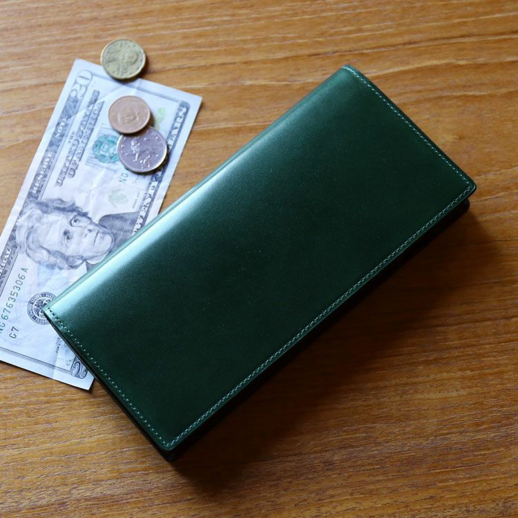 深みのある自然な光沢が魅力的なコードバン二つ折り長財布。