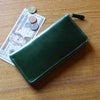 ラウンドファスナーでコの字型に大きく開くファスナー長財布です。