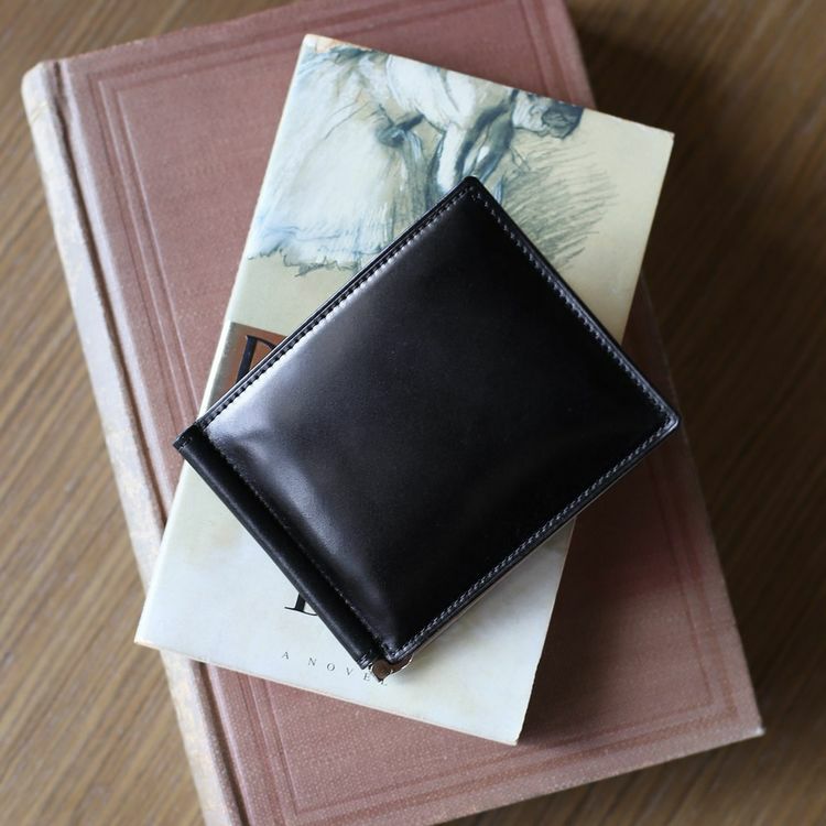 無駄な装飾の無いシンプルなデザインで、コードバンの素材感が生きた財布です。