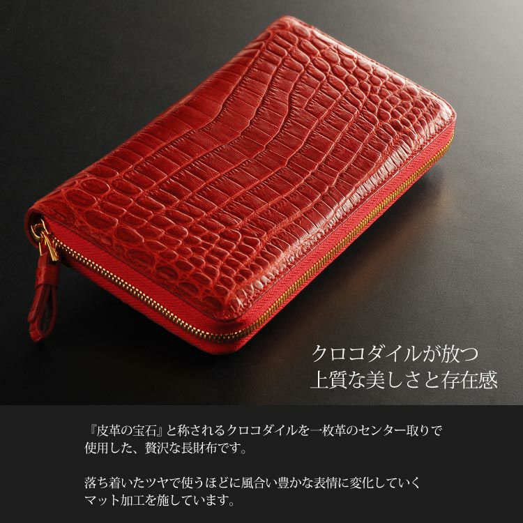 クロコダイルを一枚革のセンター取りで使用した、贅沢な長財布です。
