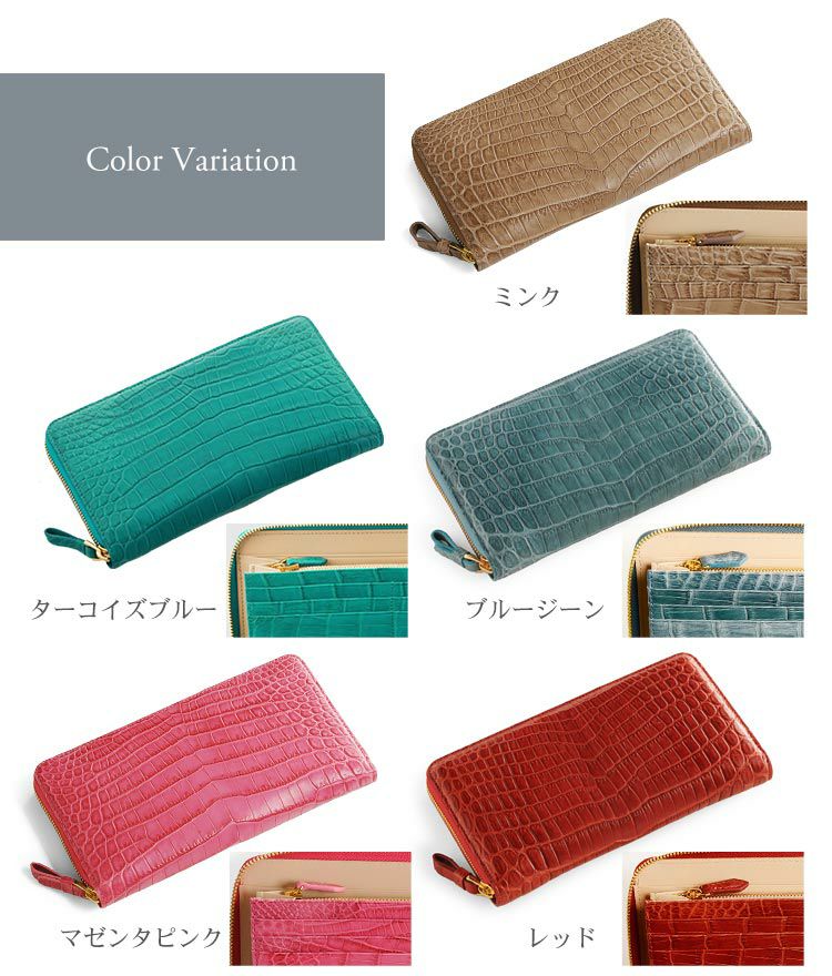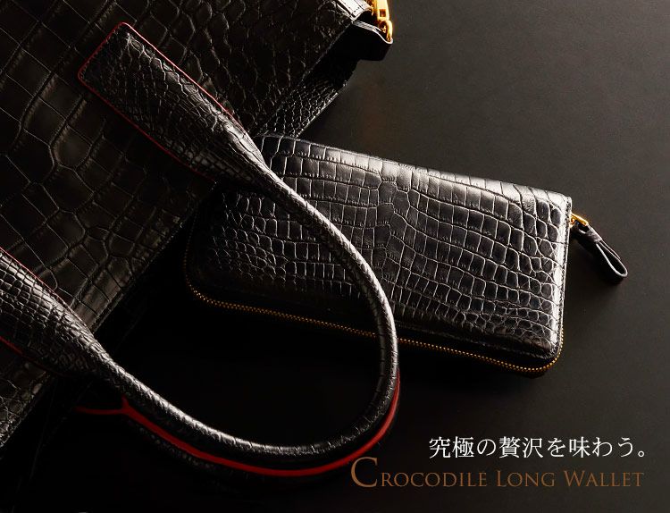 金色に輝く真鍮のラウンドジップや内側もクロコダイルを使用した豪華さが特徴的。