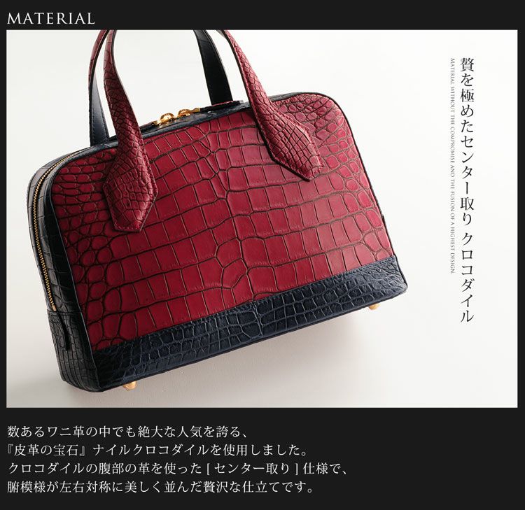 数あるワニ革の中でも絶大な人気を誇る、『皮革の宝石』ナイルクロコダイルをセンター取りで使用。