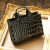 ブラックカラーをベースに様々な加工を施した、クロコダイルトートバッグ。