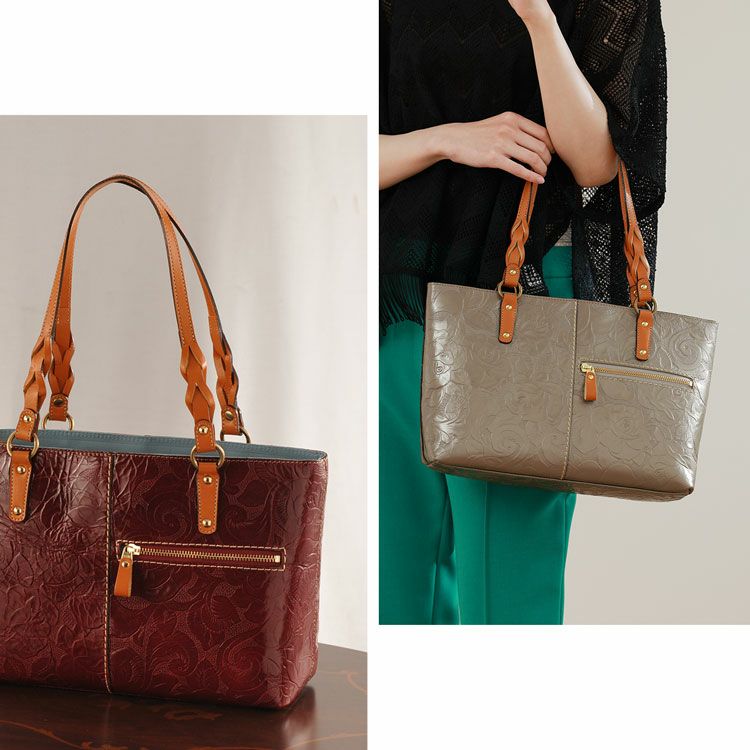 ローズの花柄を牛革に型押しした革で仕立てた本革トートバッグ。