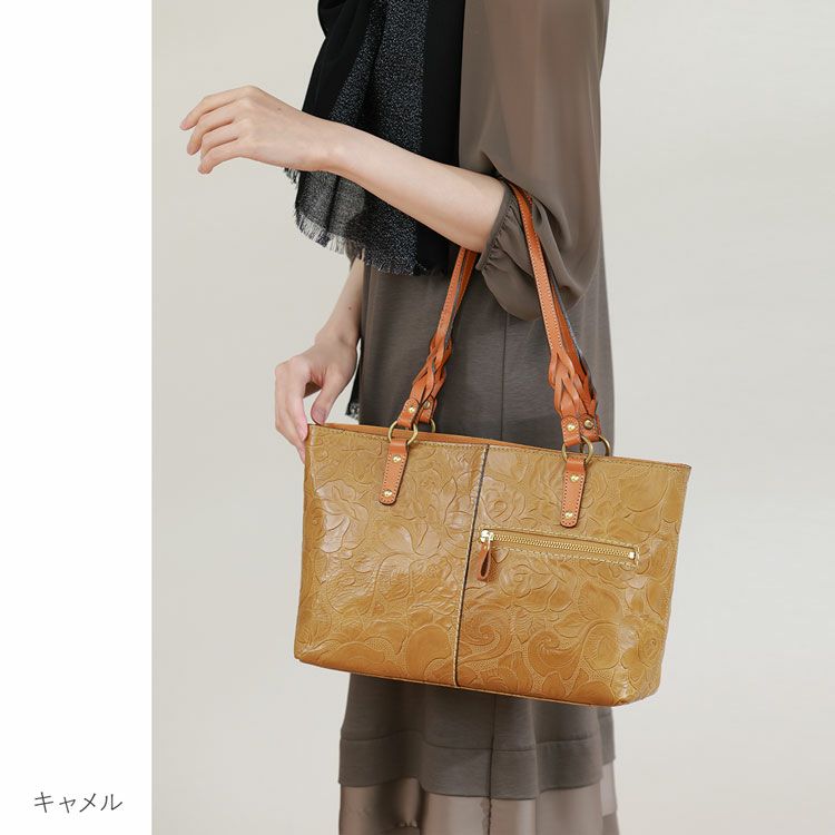 牛革 トートバッグ レディース ローズ柄 型押し Jamale 日本製 花柄 通勤 バッグ 本革 B5 サイズ あおりポケット 付き ハンドバッグ 本皮 皮 革 バラ柄 母 女性 肩掛け 母の日 ギフト プレゼント 4FB (07000051r)