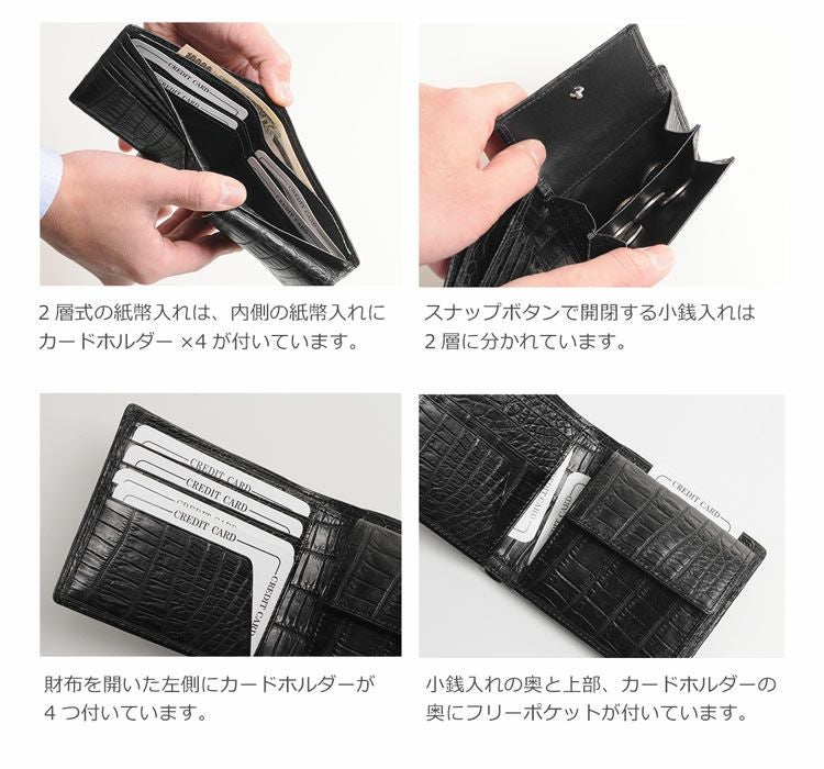 | 素材 | 表側:クロコダイル 内装:クロコダイル (紙幣入れや小銭入れ内部は本革、カードホルダー内部は合皮や生地を使用) |