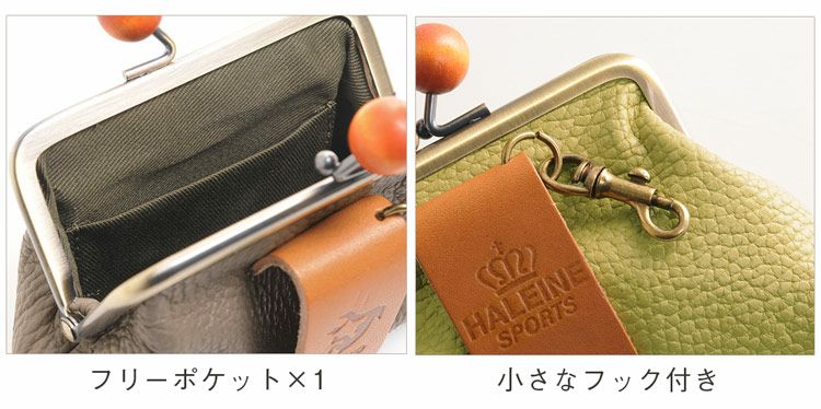 パカッと開くがま口の牛革ポーチ。