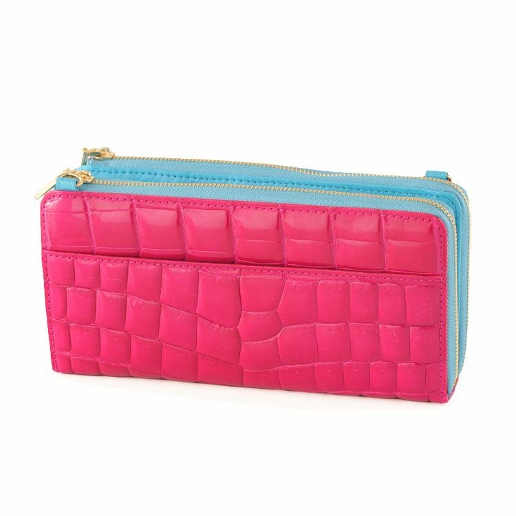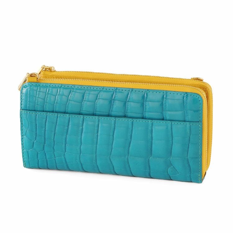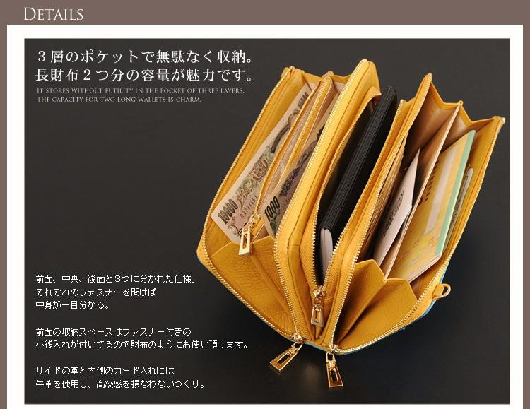 2つのL字ファスナーで大きく開き、お札入れやカードホルダーが充実。
