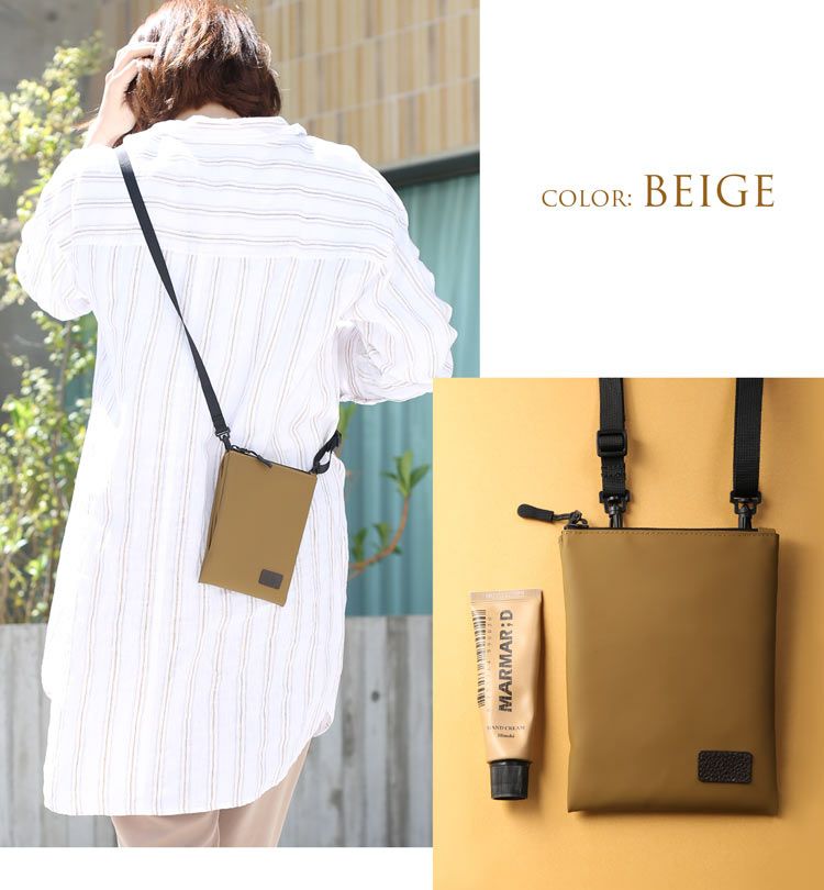 落ち着いたシンプルなデザインであらゆるコーディネイトに合わせられる万能なサコッシュ。