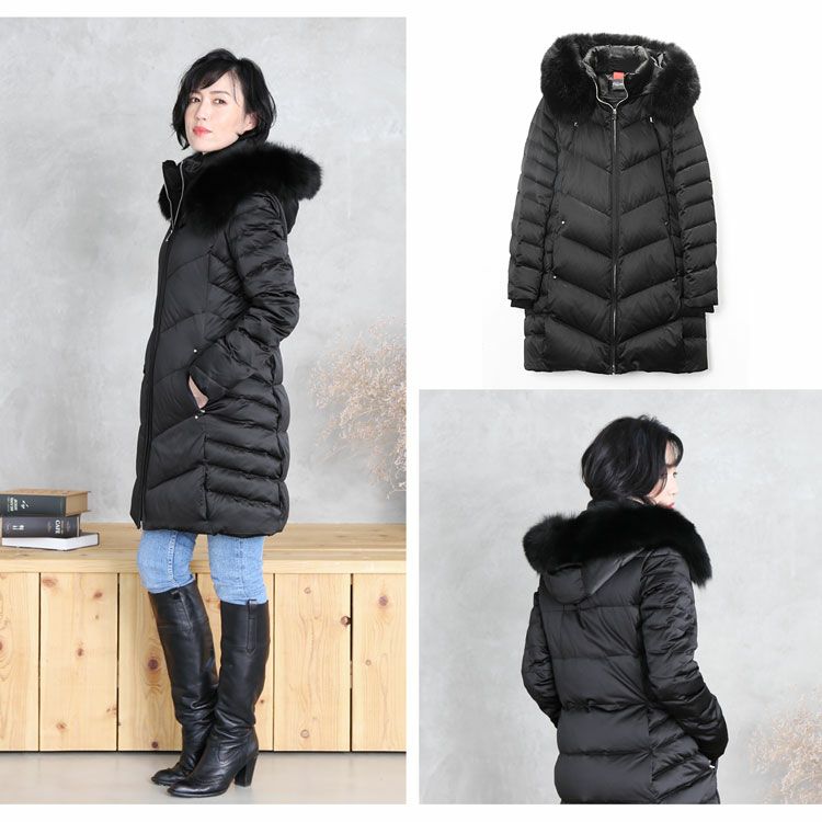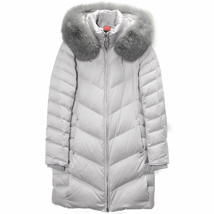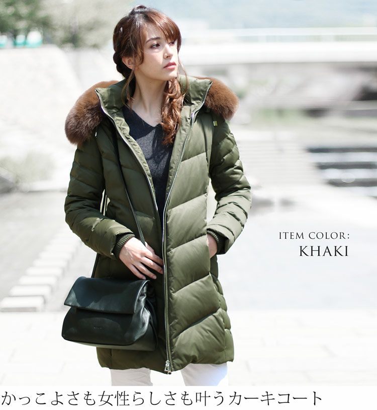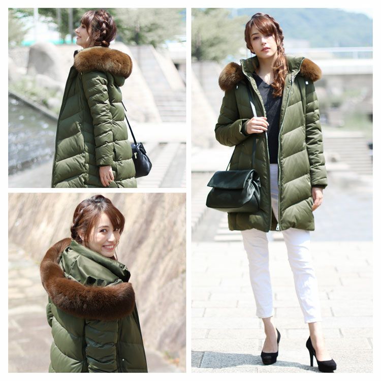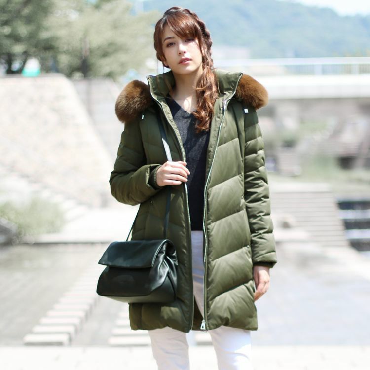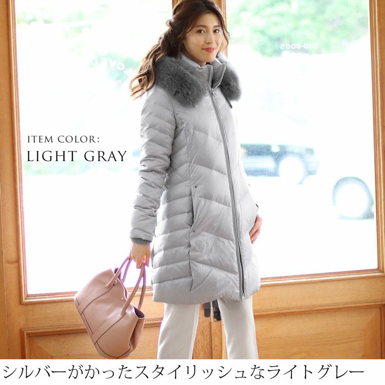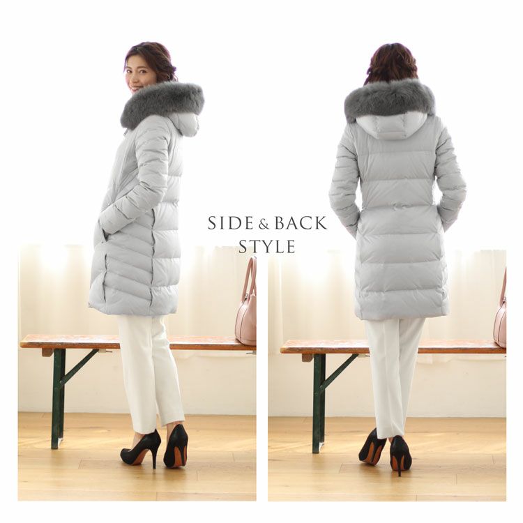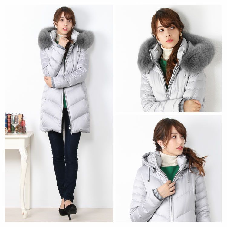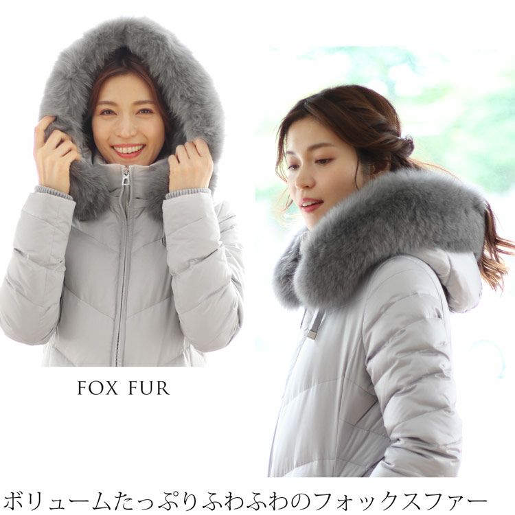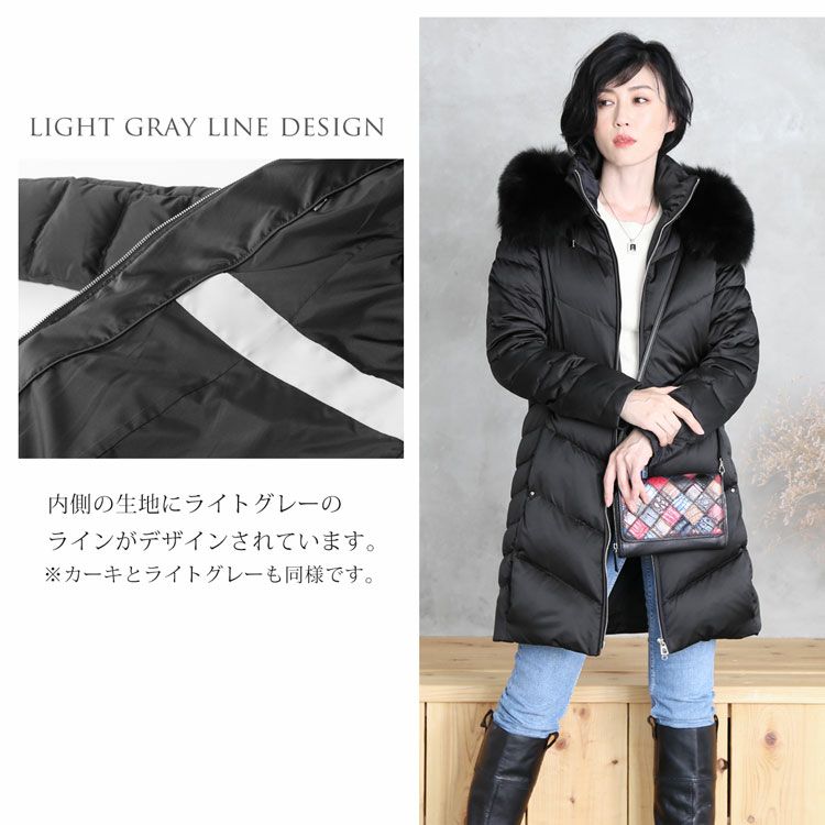 商品名:Filomo ブランド ダウンコート レディース フード付き フォックス ファー トリミング ダウン90% 使用 ライトグレー/カーキ/ネイビー/ブラック M/L/LL |