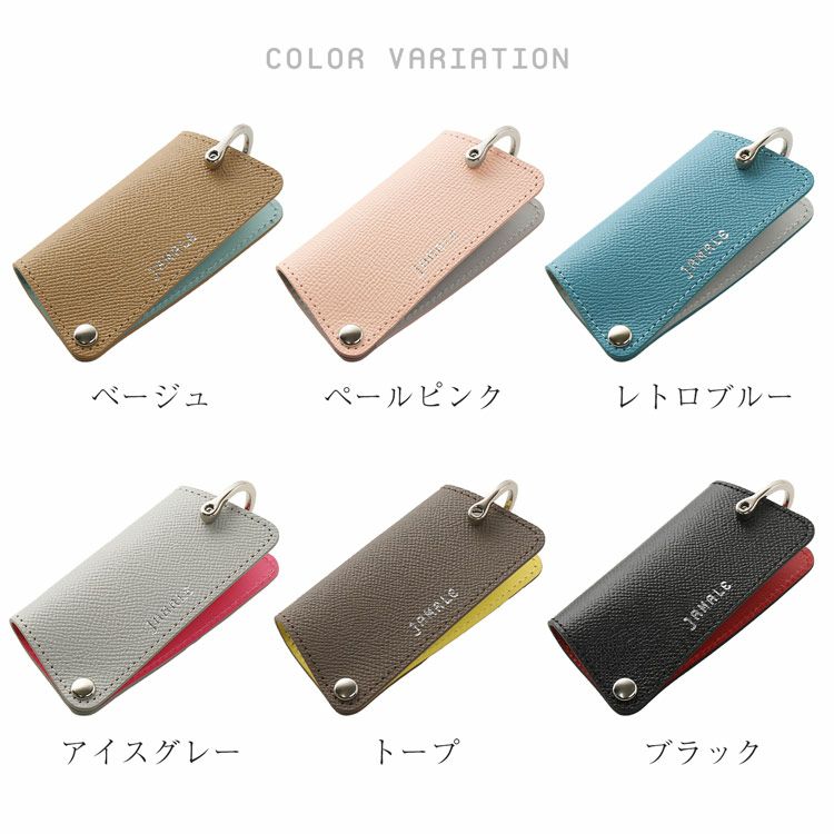 大人の手元にも馴染む落ち着いたトーンのレトロブルー。 内側はライトグレーで上品に。 アイスグレーの内側は鮮やかなピンク。 さりげないビビッドカラーがおしゃれな配色です。 トープは年齢を問わず使いやすい人気のカラー。 シックなトープと明るいイエローのバランスが◎ 長い時間をかけて培われた職人技で ひとつひとつ丁寧に作り上げるMade in Japanの革製品。 『ずっとそばにいれくれる、相棒のような存在に』 そんな願いと真心がこめられた日本製アイテムです。 丈夫で耐久性に優れた牛革を使用しています。 上品で高級感のある型押しで傷が目立ちにくいエンボスレザーと、 滑らかで心地の良い手触りのスムースレザーを組み合わせています。 鮮やかな配色がおしゃれなバイカラーもこだわりのポイントです。 定番のベージュもバイカラーで遊び心をプラス。 明るいブルーで品よくまとまった配色です。 かわいらしさを求めるならやっぱりピンク。 内側のグレーがおとな女子にちょうどいいバランス。 定番のブラックには目を惹くレッドをアクセントに。 男性も違和感なくお使いいただけるカラーです。 金具に直接取り付けるとスマートに収納できます。 キーケースから鍵を外したり、付け替える機会が多い場合は リングに取り付けるのがオススメです。 縦6.5cm×横4cm×幅1.5cmまでのスマートキーにも対応しています。 鍵のサイズ・形状により収納できない場合もござます。 ご確認の上お買い求めください。