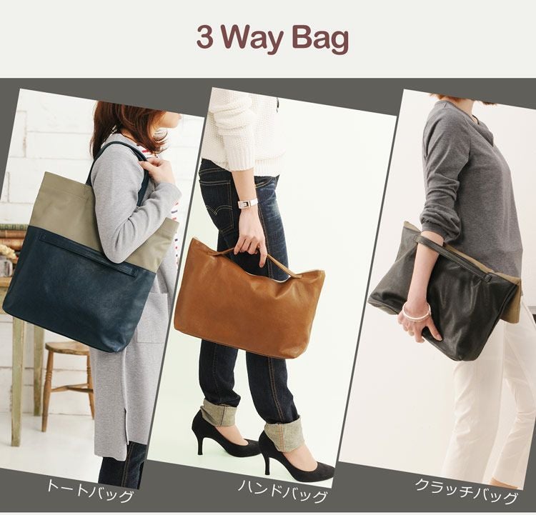 商品名:牛革 トートバッグ バイカラー 3Way ハンドバッグ クラッチバッグ / レディース
