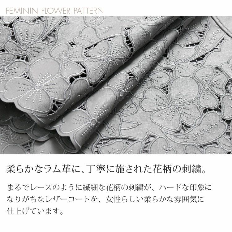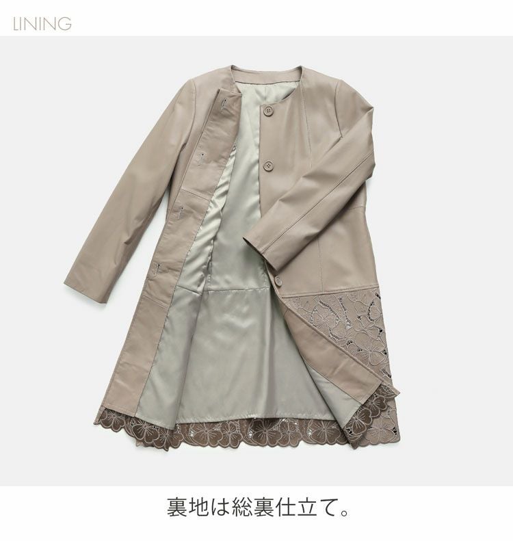 | 商品名:ラムレザー ノーカラーコート 花柄切り替えデザイン 比翼仕立て |