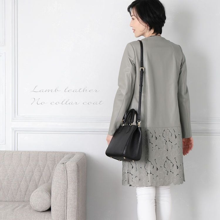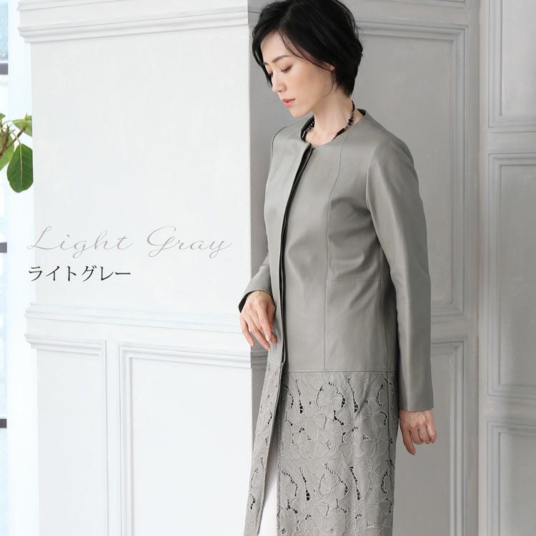 ラムレザー ノーカラー コート ロング丈 レディース 花柄切り替え 比翼 7F