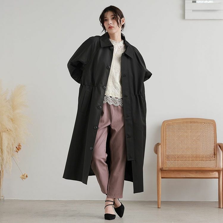 ロング丈のコートでも、ウエストを絞ればすっきりと着こなせます。
