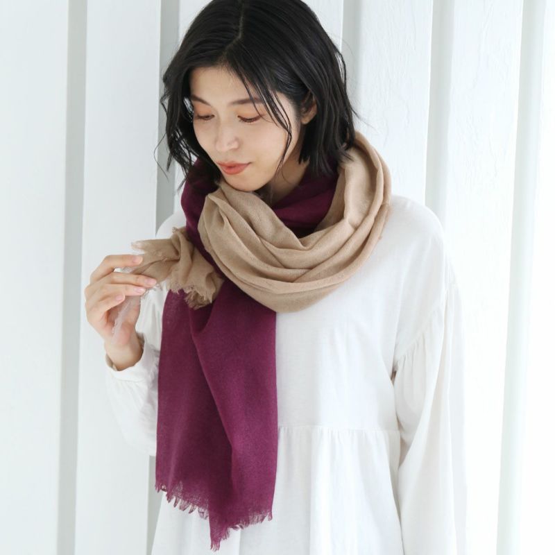 素材はアルバスカシミヤ100%を使用し、軽くて柔らかなガーゼ素材に仕上げています。 保温性と通気性を兼ね備えているので、秋冬は暖かく春夏にはサラッと風を通します。 夏にはオフィスなど屋内での冷房対策にも屋外の紫外線対策にも使えます。 寒暖差の激しい春先や秋口にも、手軽に持ち歩ける羽織りものとして役立ちます。 折りたたむと小さくなるので、バッグに入れておくととても重宝します。 カシミヤの繊維はとても細く、クリンプと呼ばれる縮れがあります。 その細い繊維が複雑に絡み合い、空気をたっぷり含むことで 優れた保温性を生み出しています。 アルバスカシミアは内モンゴルの中でも最高級原料と言われています。 その白さと肌触りからカシミヤの女王と称され、 内モンゴル産の中で最も風合いが良いと言われています。 全長200cmと長めの大判ストールなので、巻き方のアレンジを楽しめます。 マフラーのように首元に巻いたり、肩から羽織ってアウター代わりにもなります。 ▼贈り物として、母の日や誕生日のプレゼントとしてご購入頂いた方のお声を紹介します。▼ 『手触りもよく、色も大変綺麗でした。 夏の冷房が苦手な母へのプレゼントで重宝してくれると思います。 サイズも大きめで首に巻くとボリュームもありますが、上品です。』 『お世話になった方へのお誕生日プレゼントとして購入させていただきました。 素材の上質さとおしゃれなカラーにとてもとても喜んでくれました! 薄くて柔らかくてふわふわなようで、 年齢層の高い方への体の負担にもならず使い勝手も良いようです。 』 『プレゼントに買いました。その方は車移動が多いので、これくらいの薄いのが欲しかったと言ってくださりお気に召したようでした。 自分もほしくなりました。』 『お洒落です。大判ですが薄手なので使いやすいと喜ばれ、色使いがお洒落で気に入って頂きました。 二人の友人にプレゼントいたしましたが、大変喜んで頂き、私も嬉しいです。』