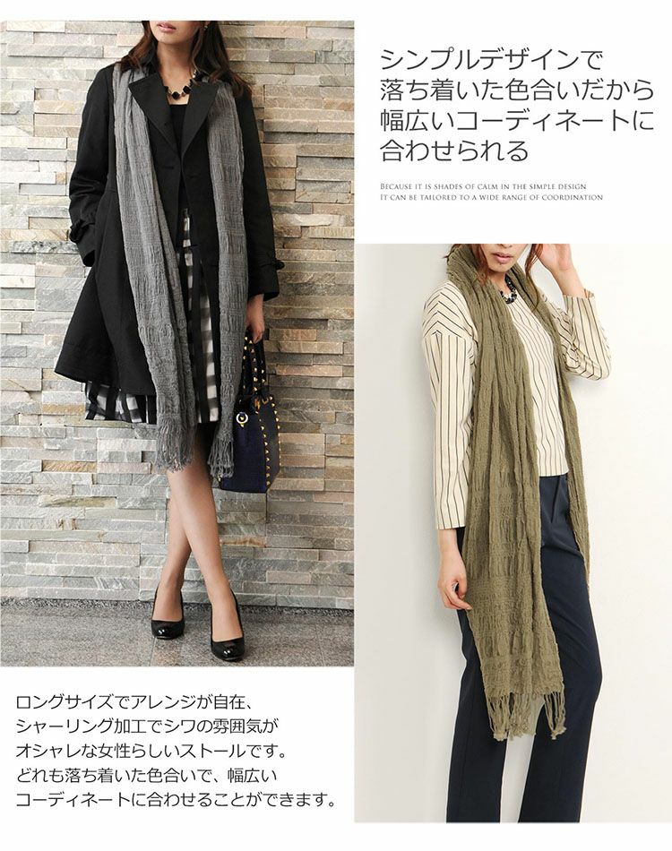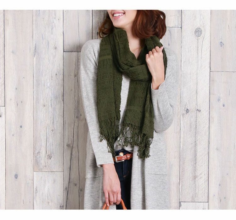 フリンジ付きのデザインで軽やかにまとえるアイテムです。