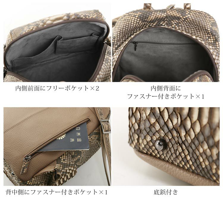 ※キーワード:蛇革 軽量 軽いかばん パイソンバッグ レディースリュック 背中ポケット 両開きファスナー