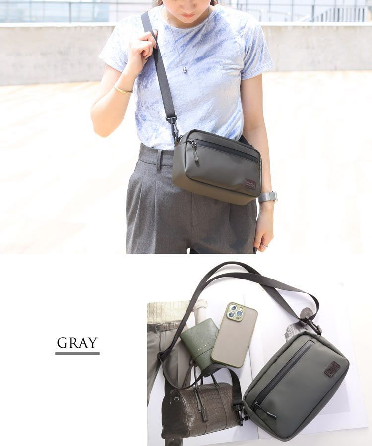レザー部分は防水レザー、ファスナーには止水ファスナーを採用した、雨に強いボディバッグです。