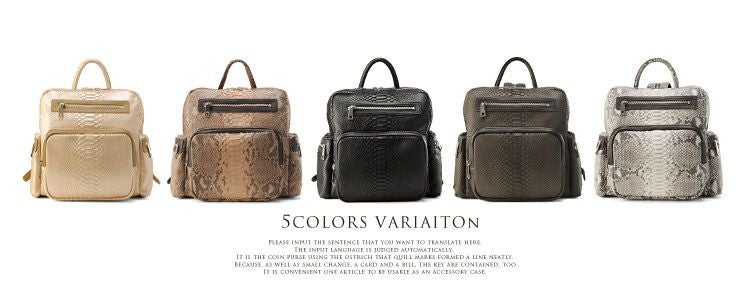 | 素材 | 外装:ダイヤモンドパイソン(一部カラー、パール加工を施しています) 牛革(背部分、ポケットの周囲) 内装:スエード調の生地、一部牛革 |