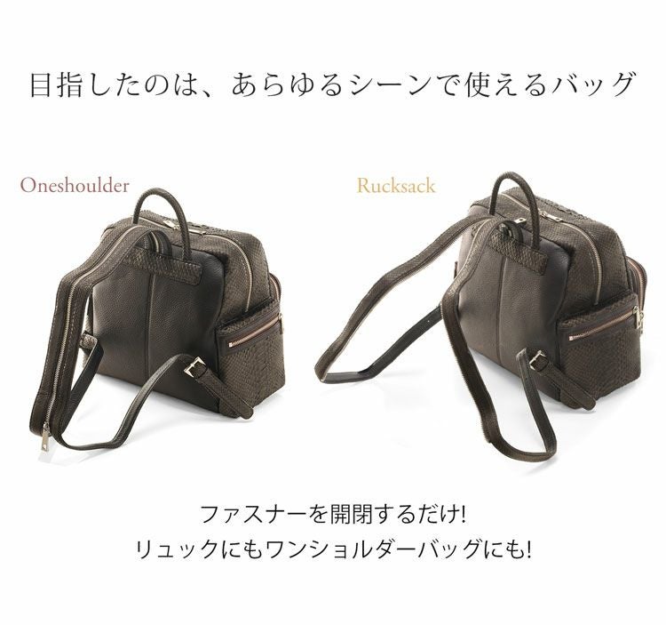 ショルダーベルトについた、ファスナーの開閉で、ワンショルダーにもリュックサックにもなります。