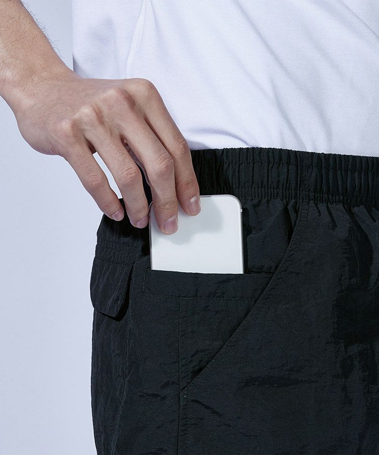 右サイドには落下防止と座った時にジャマにならないボタン付きのスマホ用ポケットを搭載。