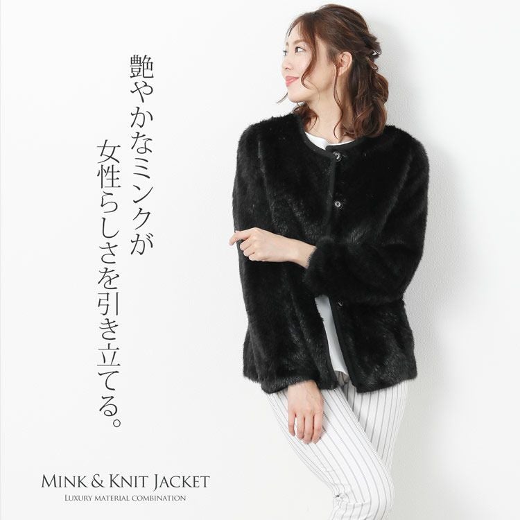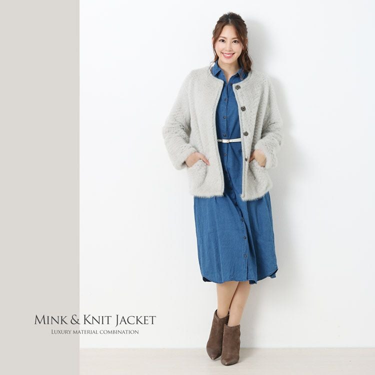 ミンク & アンゴラ混 ニット ジャケット パンチング 加工 ノーカラー 着丈65cm/レディース 高級毛皮 ファージャケット 毛皮 アウター ファー 冬物 高級 軽量 秋 冬 ギフト プレゼント ギフト