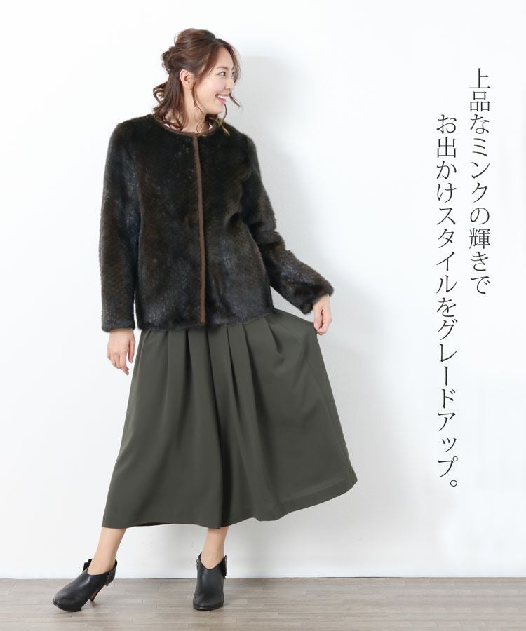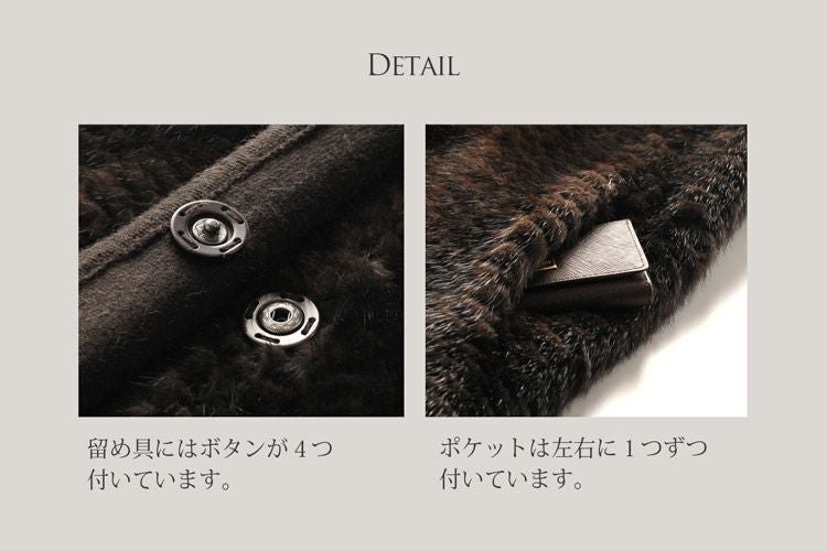 | 素材 | 毛皮:ミンク 生地:ウール40%、アンゴラ10%、ポリエステル50% |