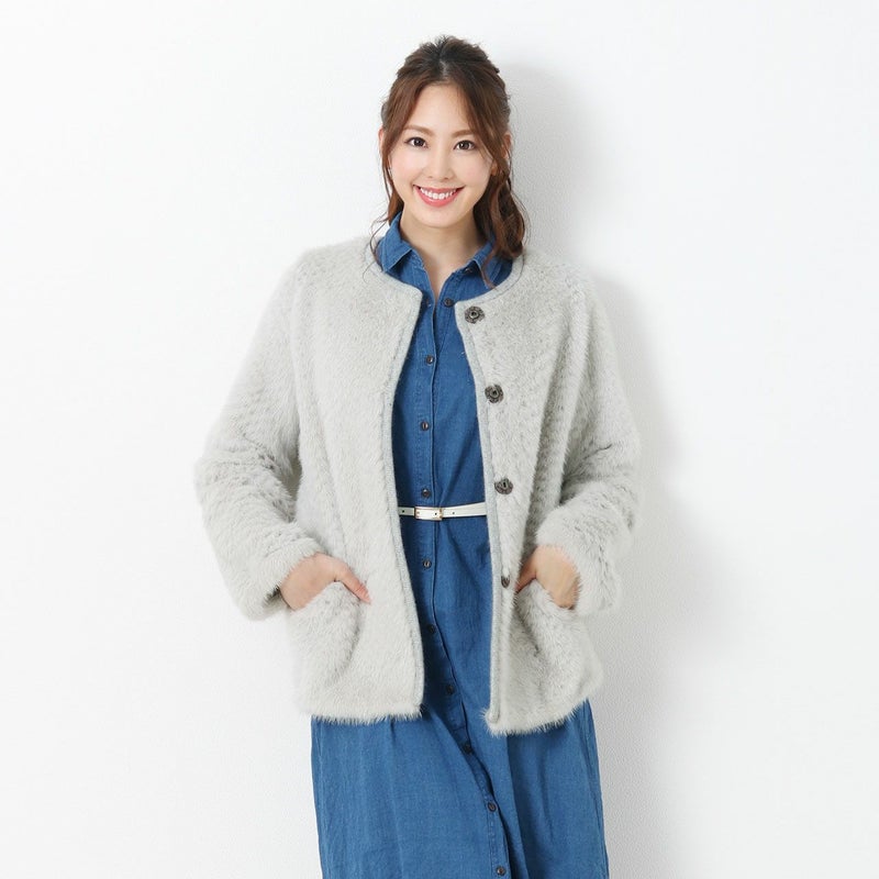 ミンク & アンゴラ混 ニット ジャケット パンチング 加工 ノーカラー 着丈65cm 7F