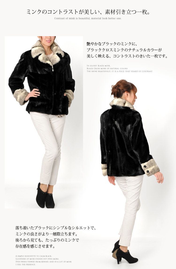 シェアード加工 ミンク ジャケット ブラッククロスミンク トリミング 着丈65cm 7F