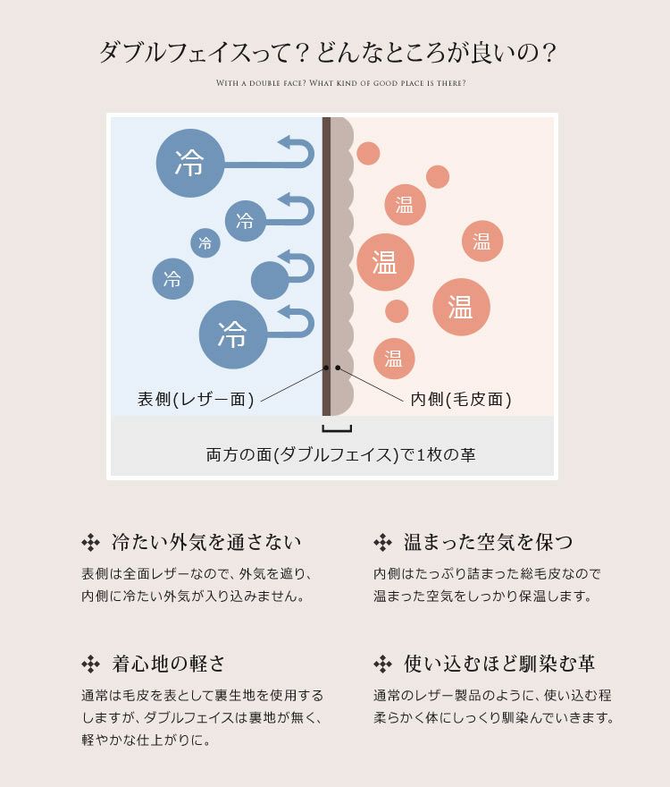 風を通さず、保温性にすぐれたWフェイスだからとても暖かく、ぬくもりのある着心地です。