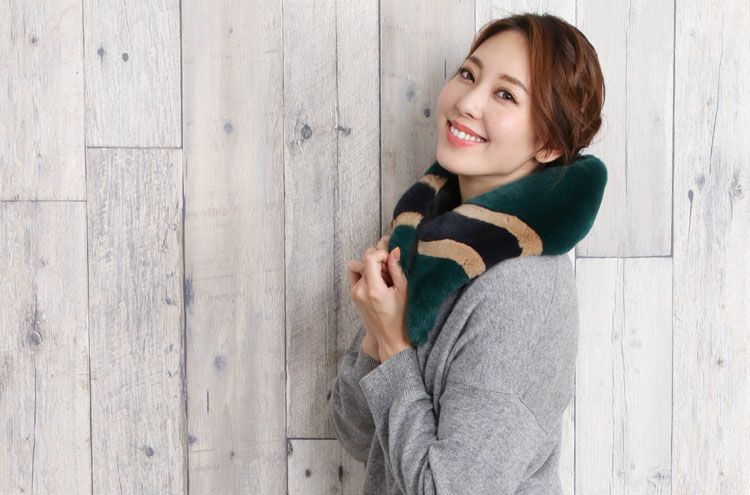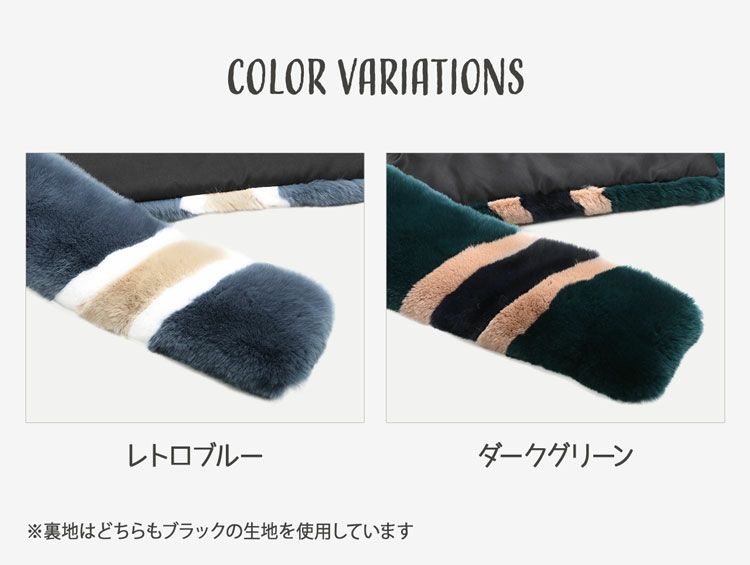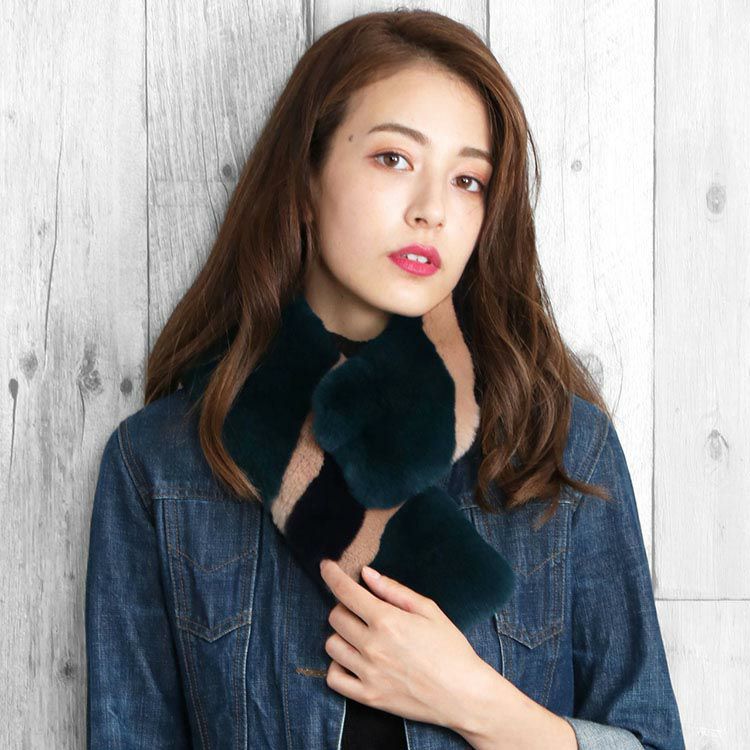 レッキス ファーマフラー クリップ式 トリコロール レディース 秋冬 ストライプ 柄 レトロブルー/ダークグリーン リアルファーマフラー ギフト