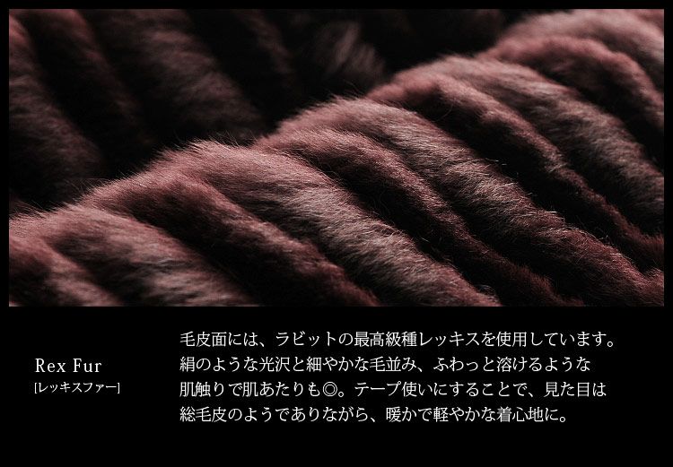 毛皮面には絹のような光沢と細やかな毛並みのラビット最高級種レッキスを使用しています。