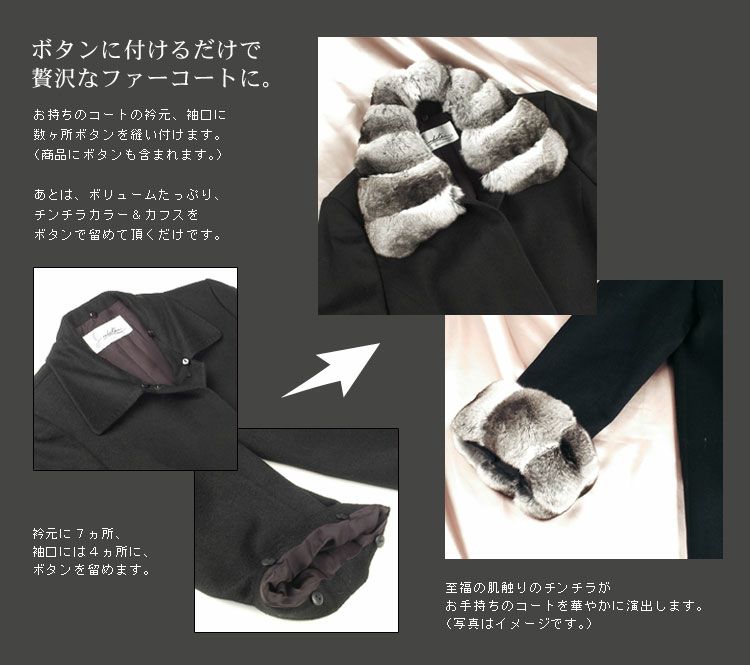 心地いい肌触りで人気のチンチラ。白と黒のコントラストが高級感あるスタイルを約束してくれます。お持ちのコートに合わせてつけることができる、カフスセット。ファーマフラーなど、チンチラを使ったファッション小物をご紹介。