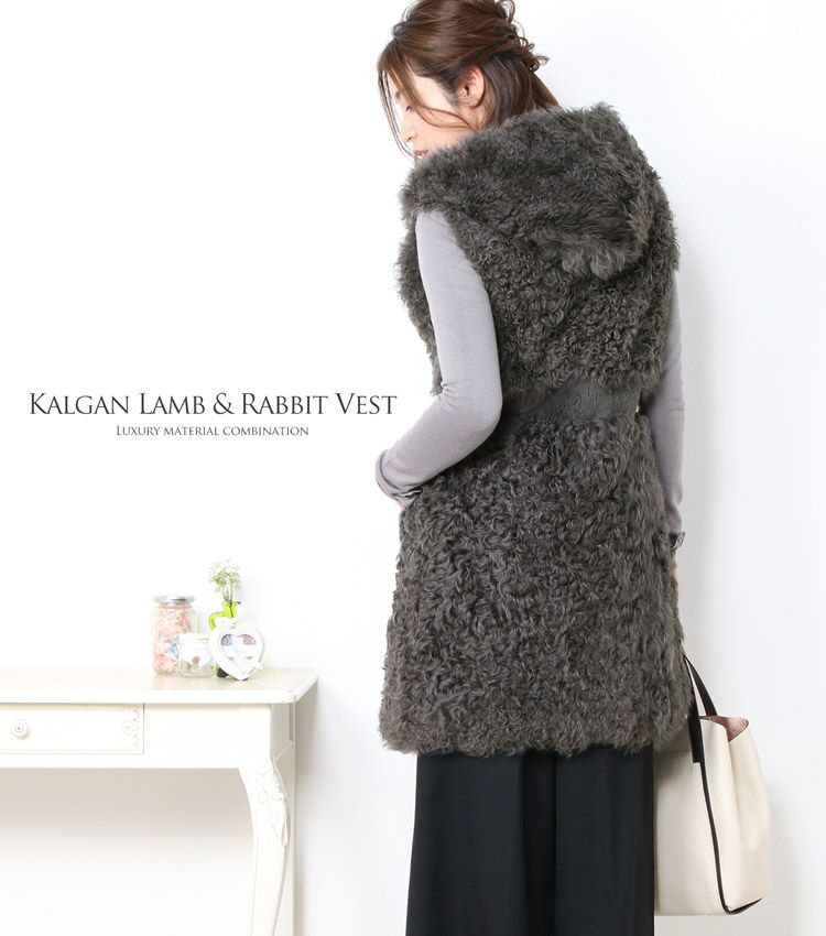 カルガンラム & ラビット ファー ベスト ロング フード付き 着丈85cm/レディース 毛皮 ファー ファーベスト ロング ラムベスト レディース コーデ アウター 秋 冬 ギフト プレゼント ギフト