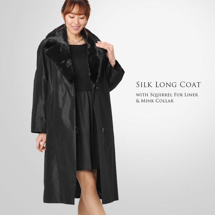 シルク100% 120cm丈 ロングコート リスライナー付き ミンク襟 毛皮 コート フリーサイズ ZF