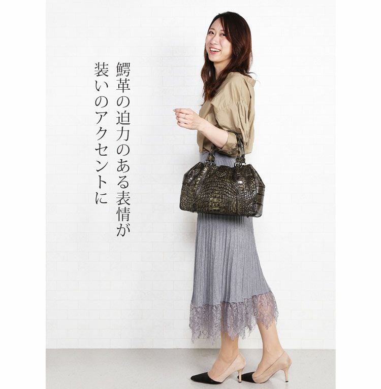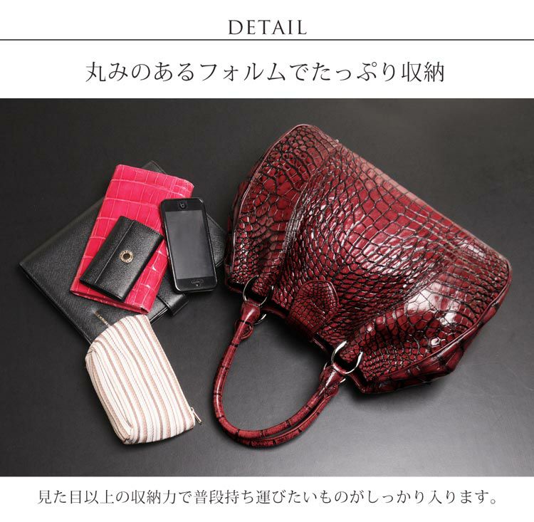 丸みのあるフォルムで女性らしい、アリゲーターハンドバッグ。