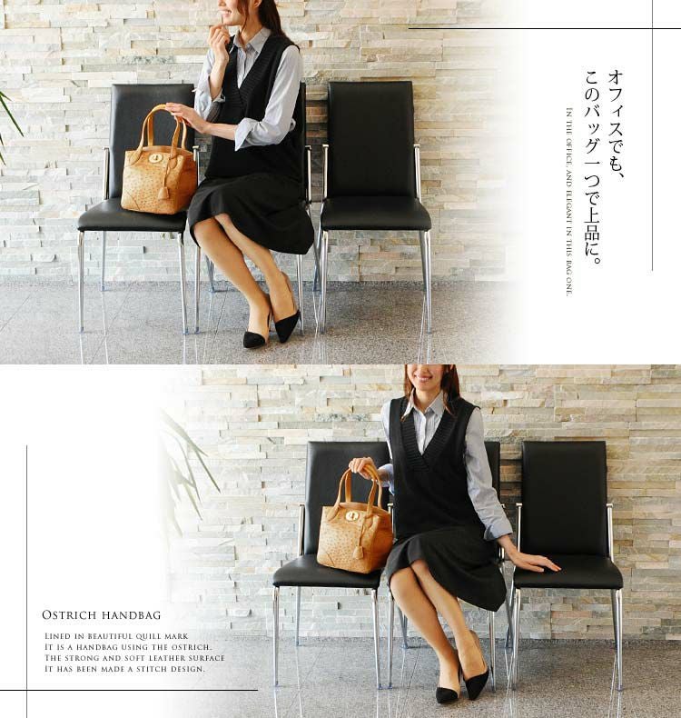 荷物の量や気分に合わせて二つのフォルムで持てる、オーストリッチのハンドバッグです。