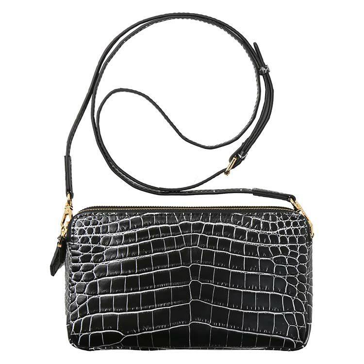 シンプルなスクエア型がかわいい、クロコダイルのミニショルダーバッグ。