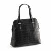 クロコダイルをセンター取りで使用したフェミニンなシルエットのハンドバッグ。