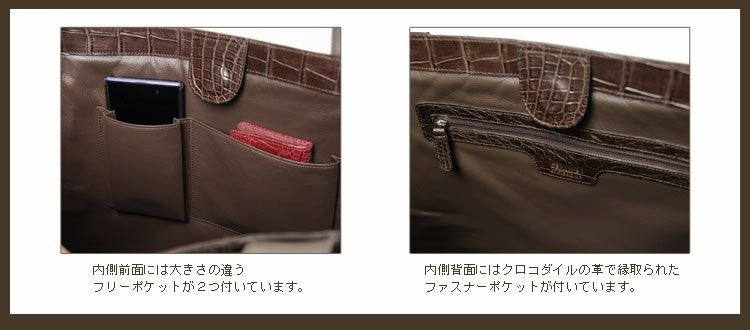 ・ファスナーポケットの周りにはクロコダイルの革を使用。
