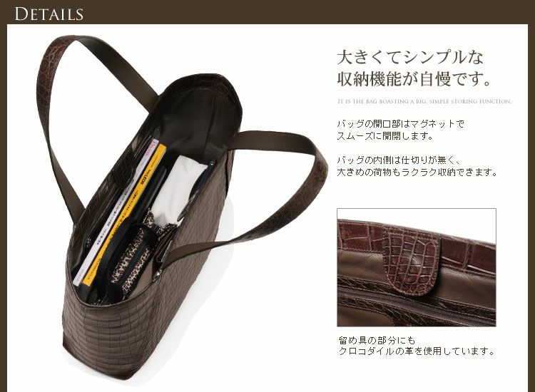 迫力のクロコダイルに大きな収納力存在感抜群のトートバッグ。
