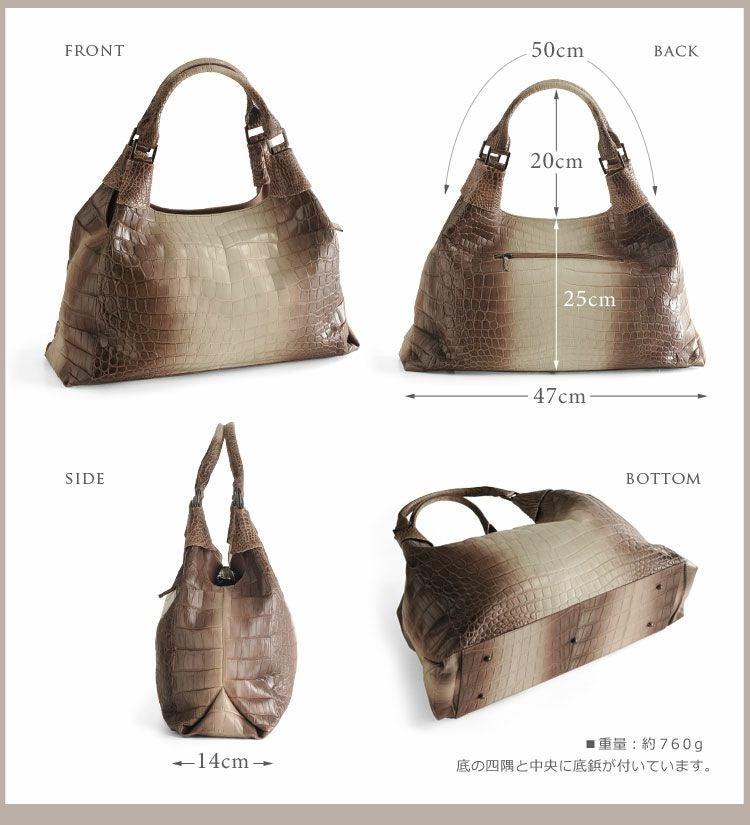 | 備考 | ・開口部の内側に丈夫な牛革を使用しています。 ・底鋲/5ヶ所についています。 ・金具カラー/ブラックニッケル ・ハンドルや底面にもクロコダイルを使用しています。 |