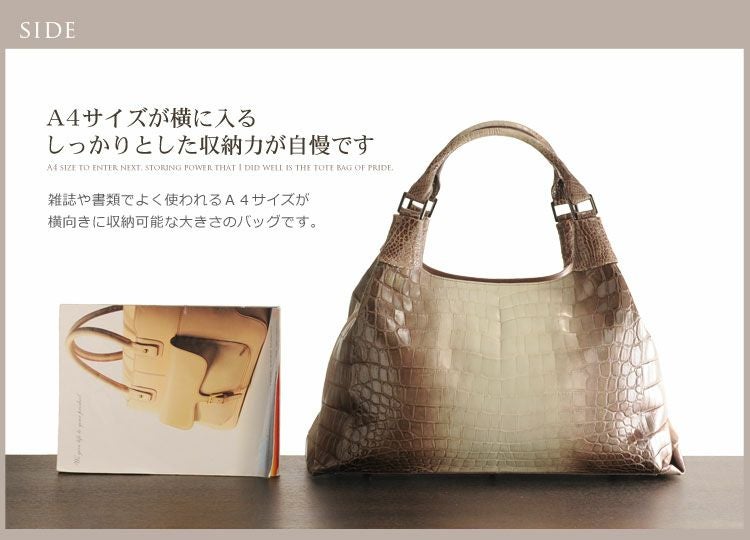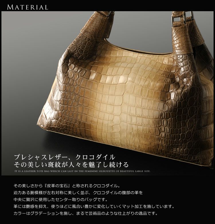 『皮革の宝石』と称されるナイルクロコダイルの美しいグラデーションが印象的なトートバッグ。