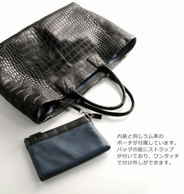 | 商品名:スモール クロコダイル トートバッグ レディース 大容量 A4 対応 マット 加工 ポーチ 付き ブラック 内装 羊革 本革 軽い 柔らかい |
