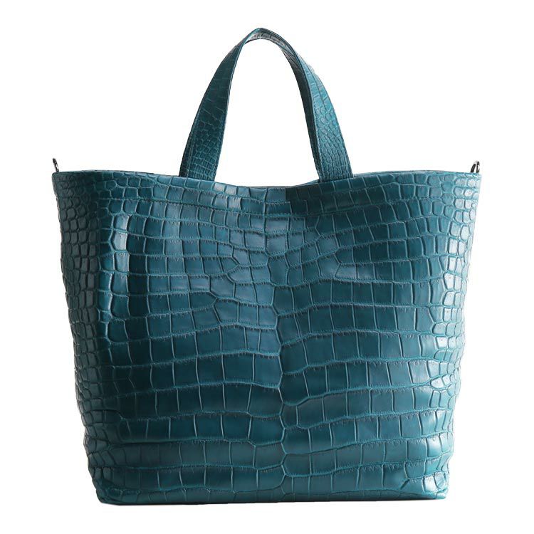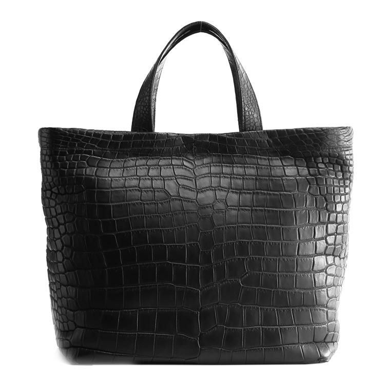 スモールクロコダイルで仕立てた大きなトートバッグ。