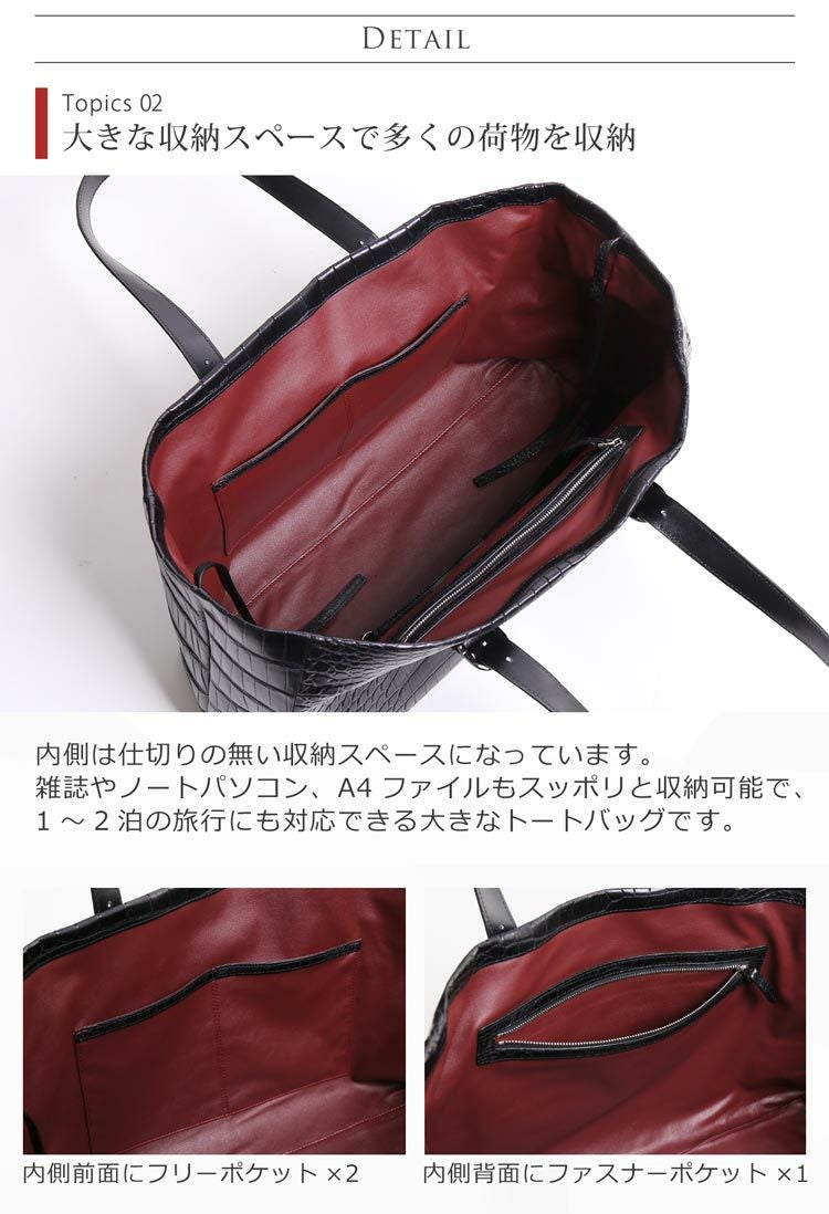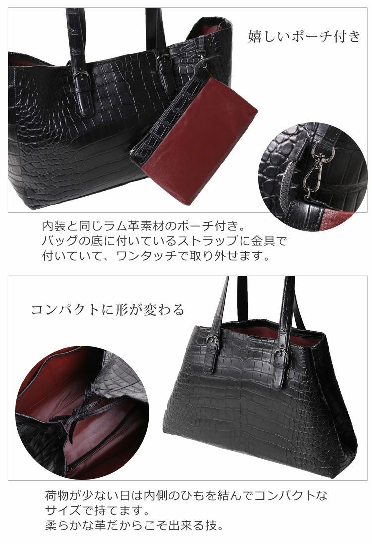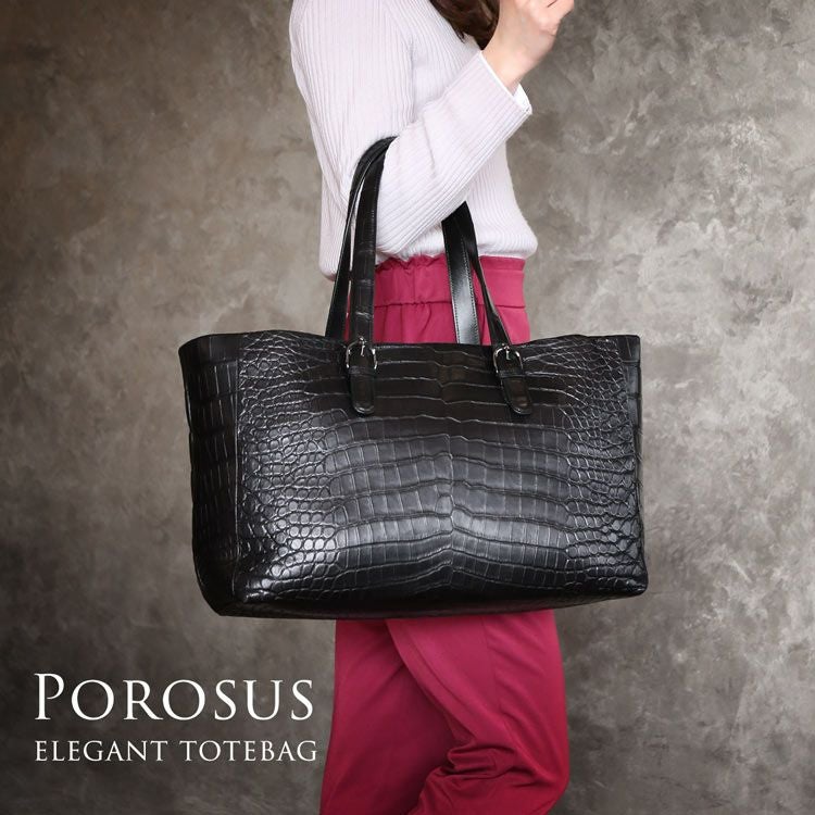 天然皮革 エキゾチックレザー スモール クロコダイル トートバッグ レディース 大容量 A4 対応 マット加工 ポーチ 付き ブラック 羊革 本革 ポロサス 旅行バッグ 安心 保証書 付き ギフト プレゼント ladiesbag mensbag